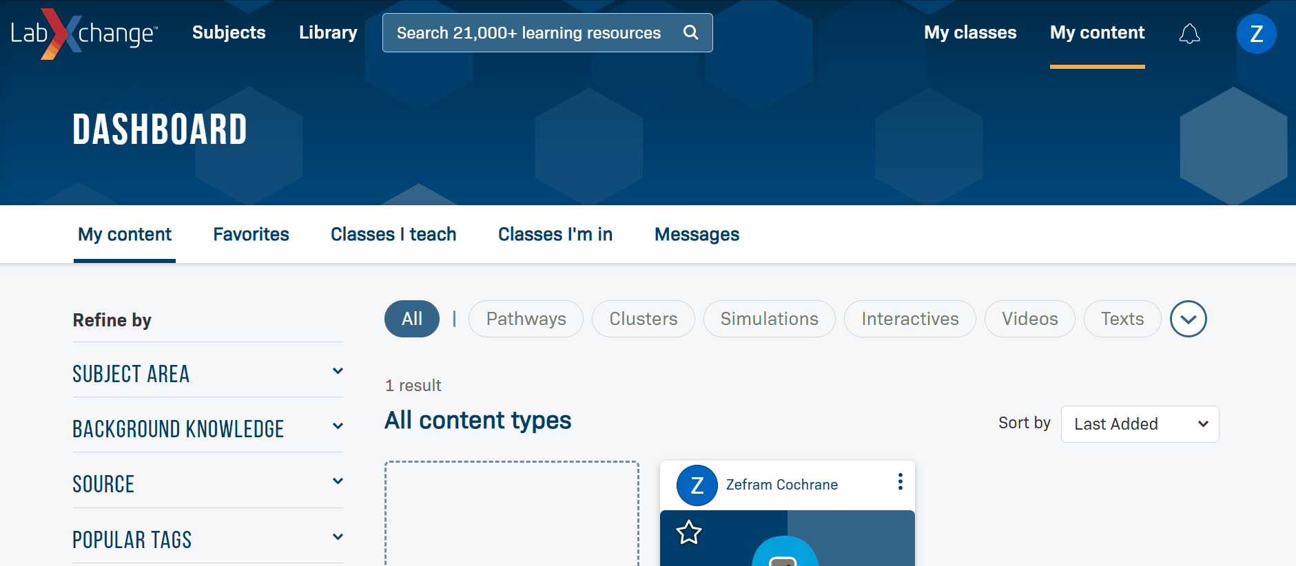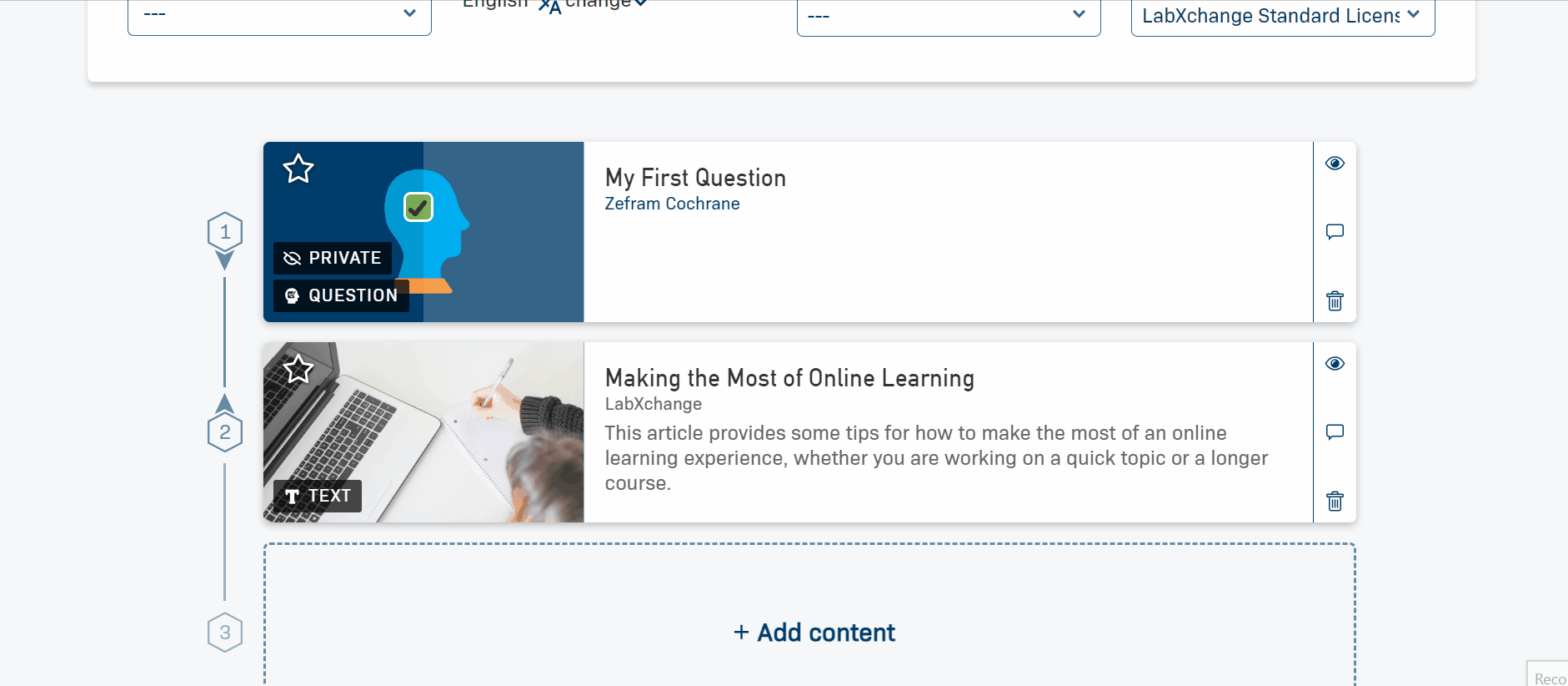 You do not need to save between each selection, so click on the Library option and we will add a piece of public content to your pathway. This section allows you to search the entire LabXchange public library using both keywords and filters. Use the Search public content section to find the article titled “Making the Most of Online Learning”. As with your question, click the + in a circle. The Add items button should now list (2) items, and clicking it will save them to your pathway.