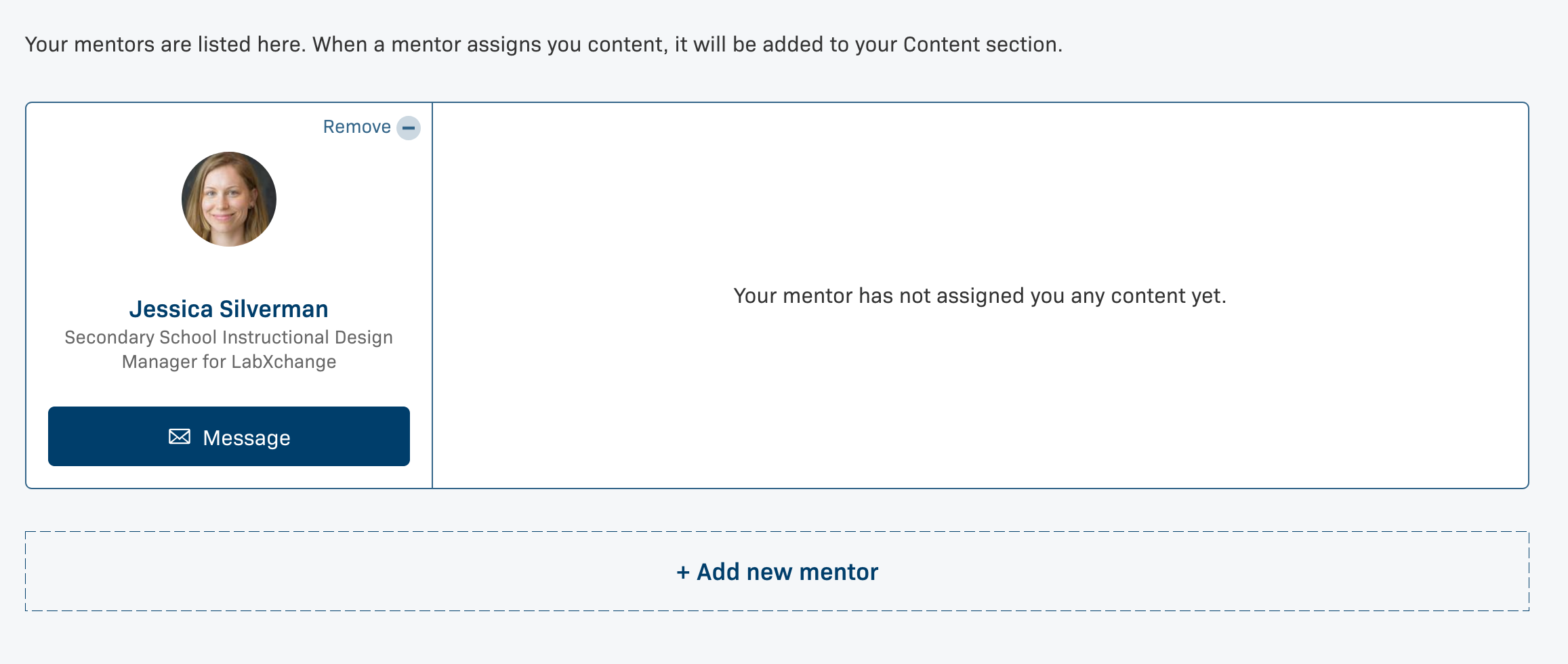 You will see your mentees listed under Mentees on the Community page. From there, you can easily message them and assign content. If you need to withdraw from mentoring a user, just click Remove. You can then write a short note to explain why you are withdrawing your mentorship.