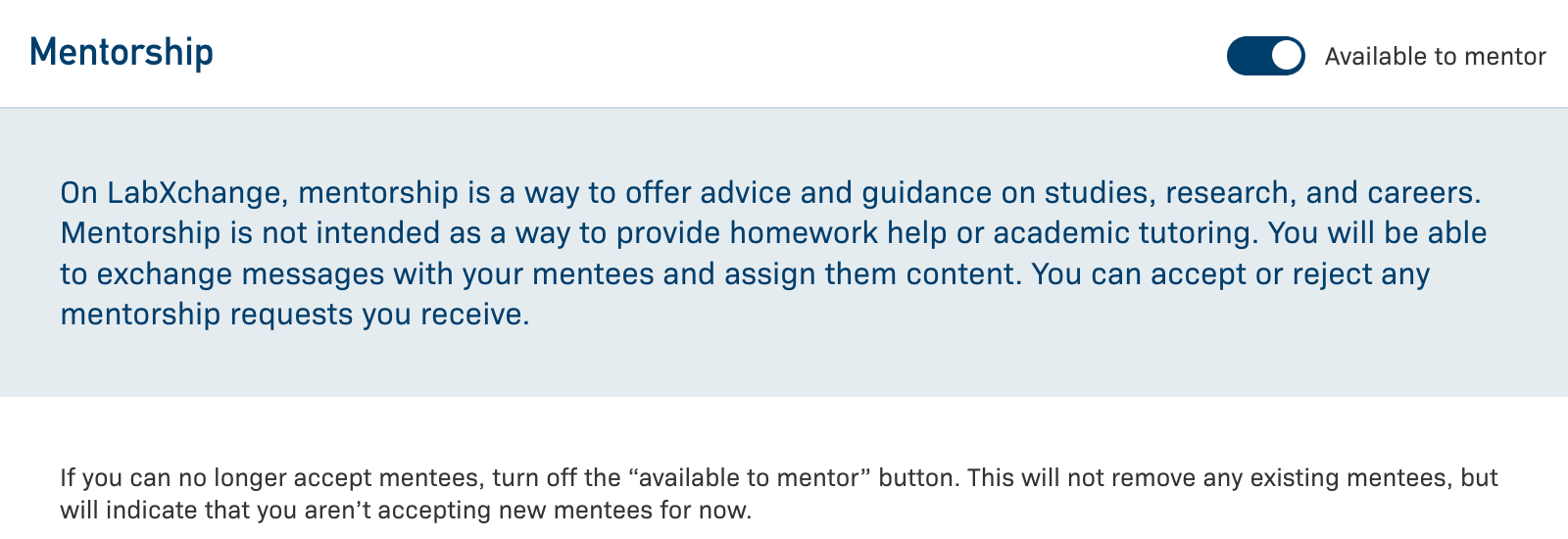 If you are interested in serving as a mentor, make sure that Available to mentor is selected on your profile. We recommend that you write a short note to your potential mentees about specific areas of interest, or types of mentorship that you would like to offer. You can accept or reject any mentorship requests you receive.