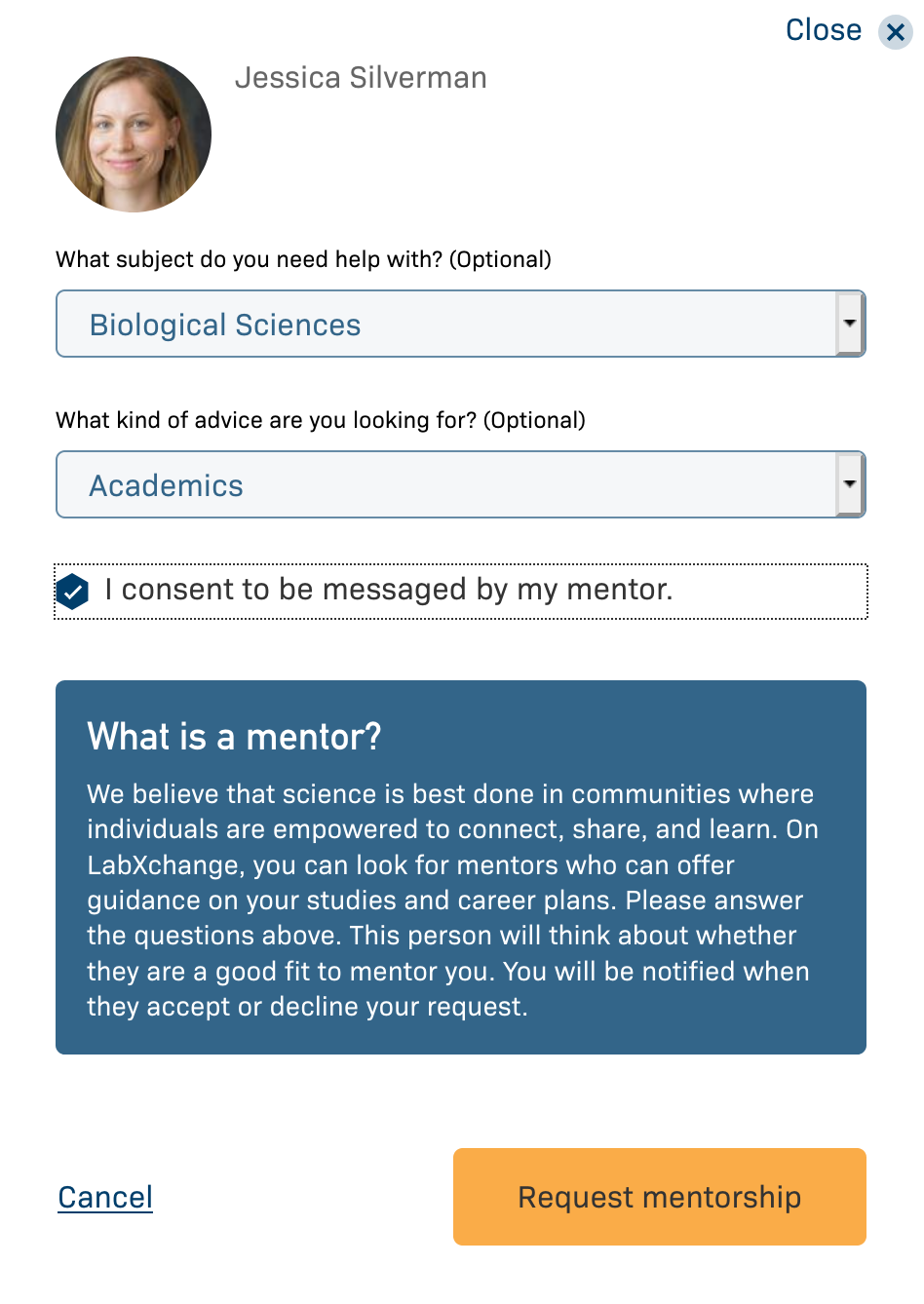 If you are interested in requesting mentorship, please answer the questions on your mentorship request thoughtfully. This will help your potential mentor decide if they are a good fit to offer the guidance you are looking for. You will be notified of their decision.