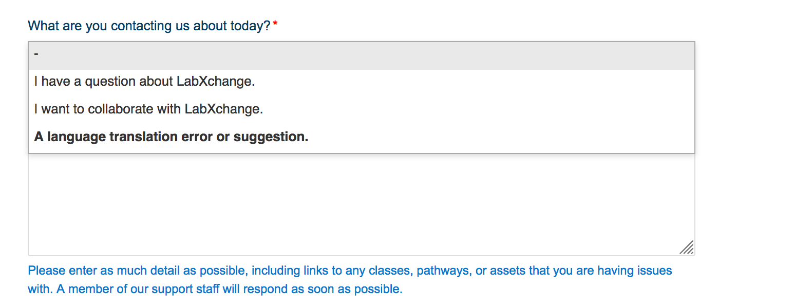 Under "What are you contacting us about today?", select "A language translation error or suggestion." Please enter as much detail as possible, and include a link or screenshot with your submission.