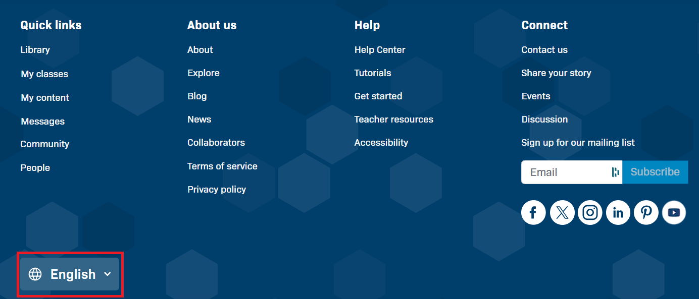 If you have not created an account or are browsing LabXchange without logging in, you can find the language menu between by scrolling to the bottom of the page.