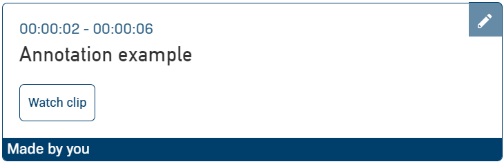 When the video is played, the annotation you have created will be displayed on the right, and will be highlighted during the starting and ending times you have specified. The annotation can be edited via the pencil icon on the top right of the annotation card.