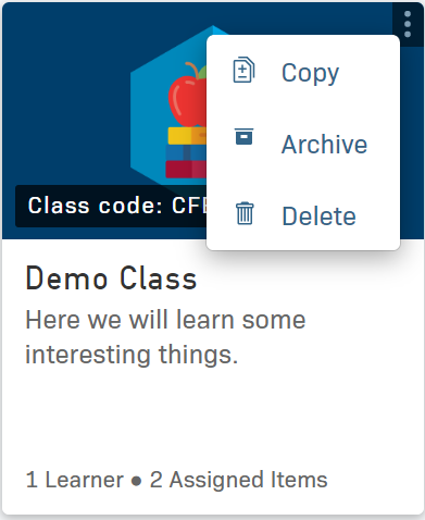First, go to the Classes I teach section of your Dashboard which will display classes you have created, as well as those on which you are a co-educator. Select the 3-dot menu from the top right of the class in question, then click Copy.