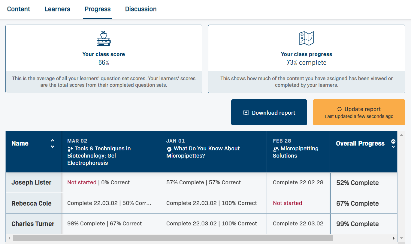 Here you can see all of the content that has been posted in your class as well as the progress or score for individual learners on each one. You can also see your class score and class progress. You can sort the progress table alphabetically by learners name, or by overall progress or score.
